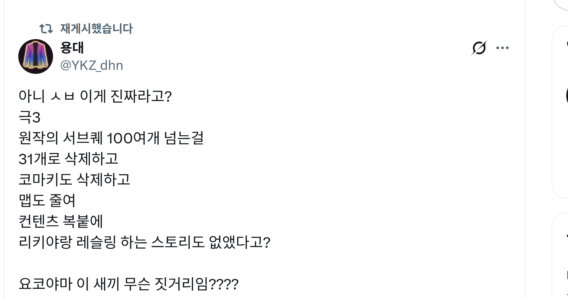1-1. 용 시리즈 근황 : 극3살돈으로 엘든링 dlc사길 잘했다! 저어번에 올린 결혼, 인투 이벤트부터 좆이돌식 여팬수금력이 느껴졌는데 그렇다고 게임을 창렬다운그레이드 시키라는 말은 안했는데? 리마3하면서도 병신게임이라고 욕 뒤지게햇는데ㅋㅋㅋ이거는 다른 종류의 빡침임 마치 다 잡은 고기 살까지 발라서 먹는 그런... 동인경지팬들 돈만 뜯어먹으려는게 눈에 보여서 그냥 예구 취소함ㅅㄱ